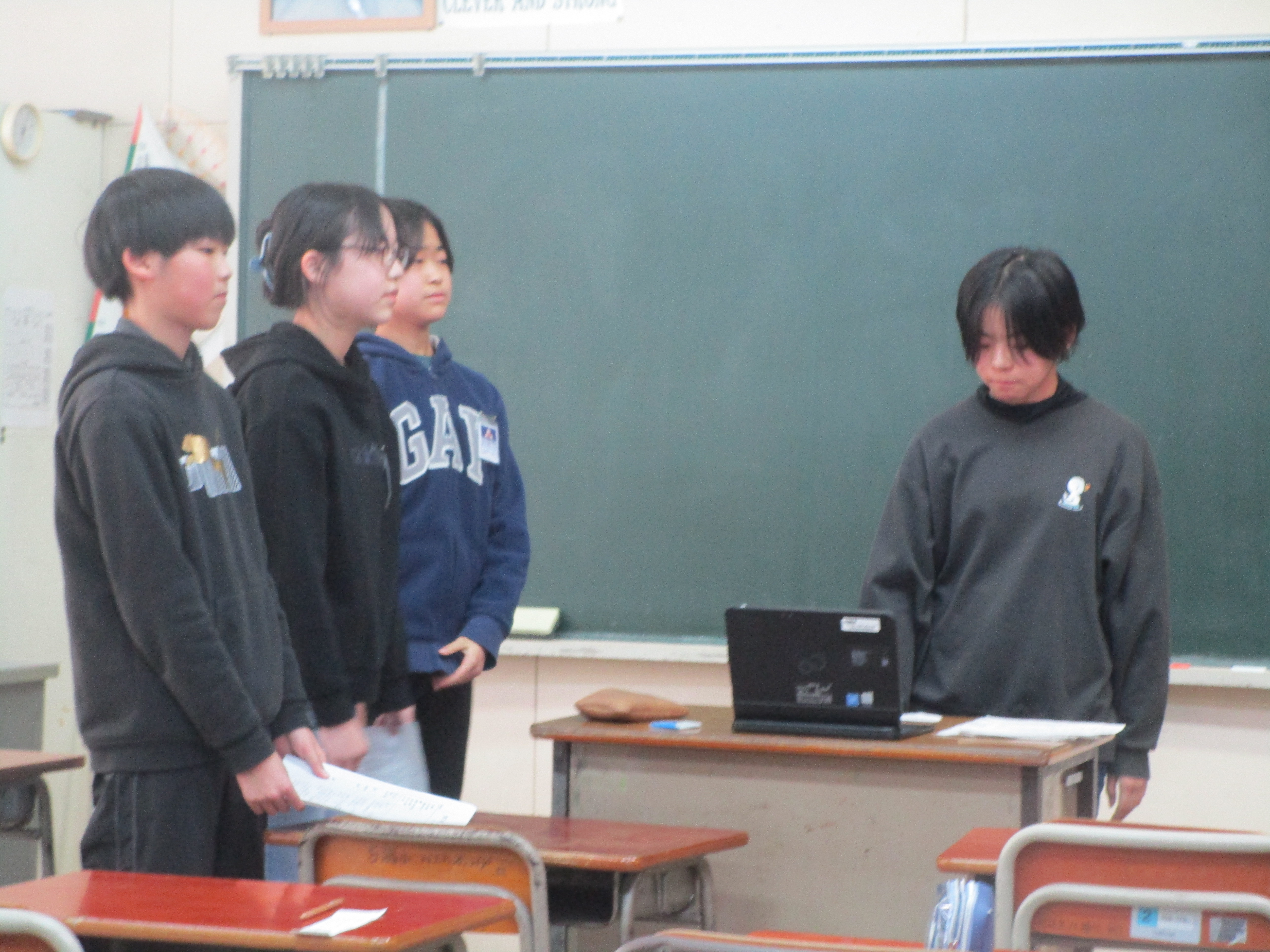 児童会長や各委員長が,1年間の活動の反省について報告し,「続けて取り組んでほしいこと」や「新たに取り組んでほしいこと」を話しました。