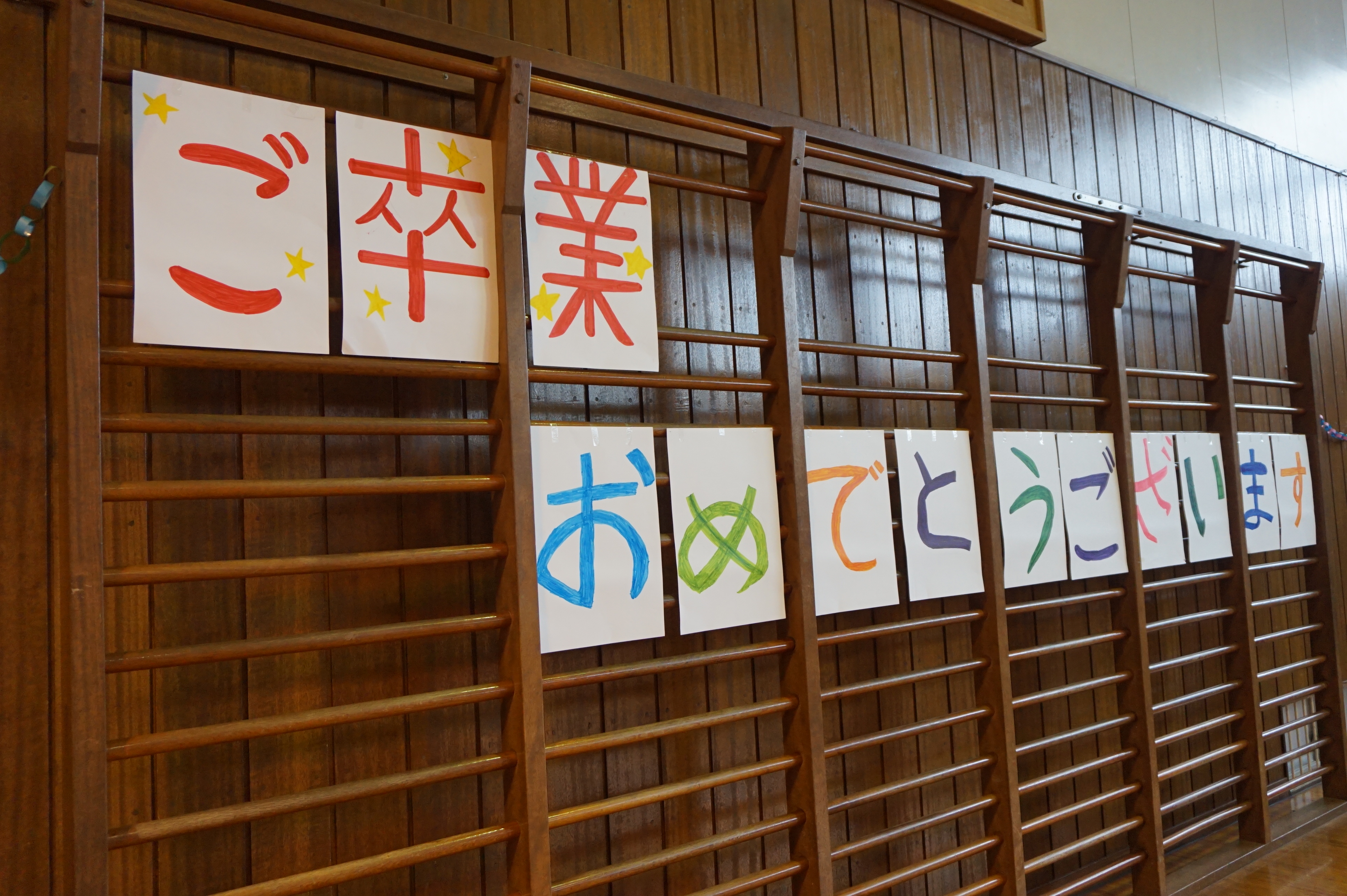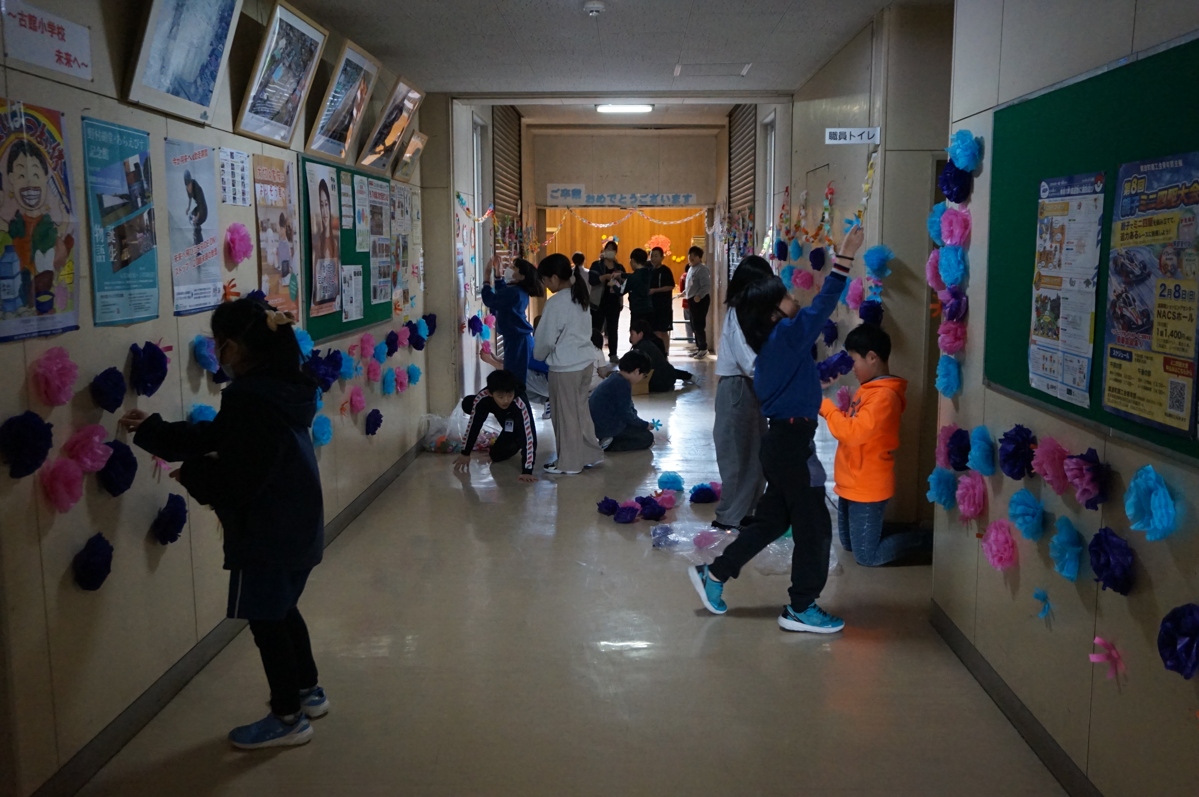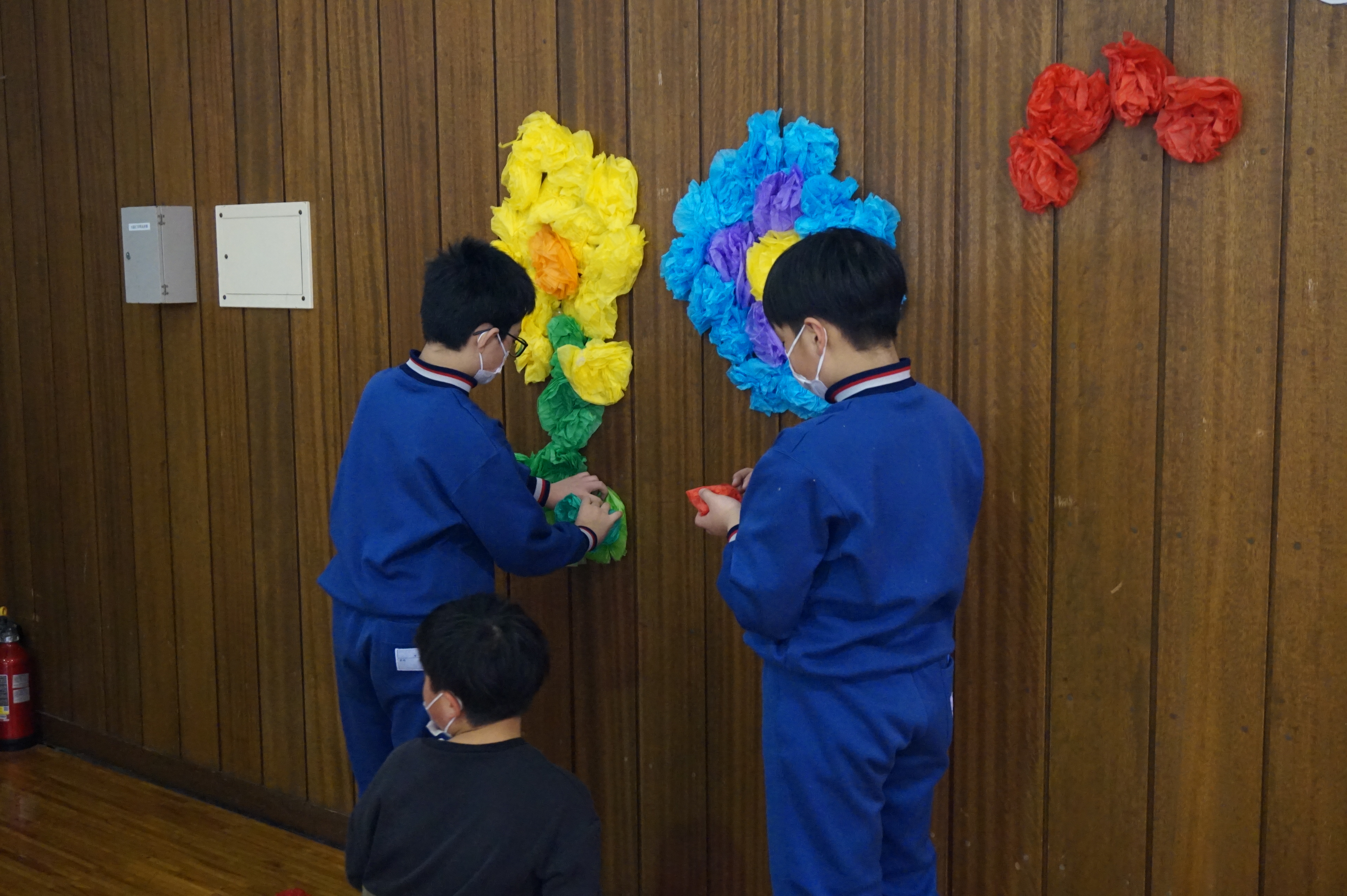 会場の体育館や体育館に通じる廊下壁面に,4,5年生が中心となって飾りづけをしました。感謝の気持ちが形にも表れています。