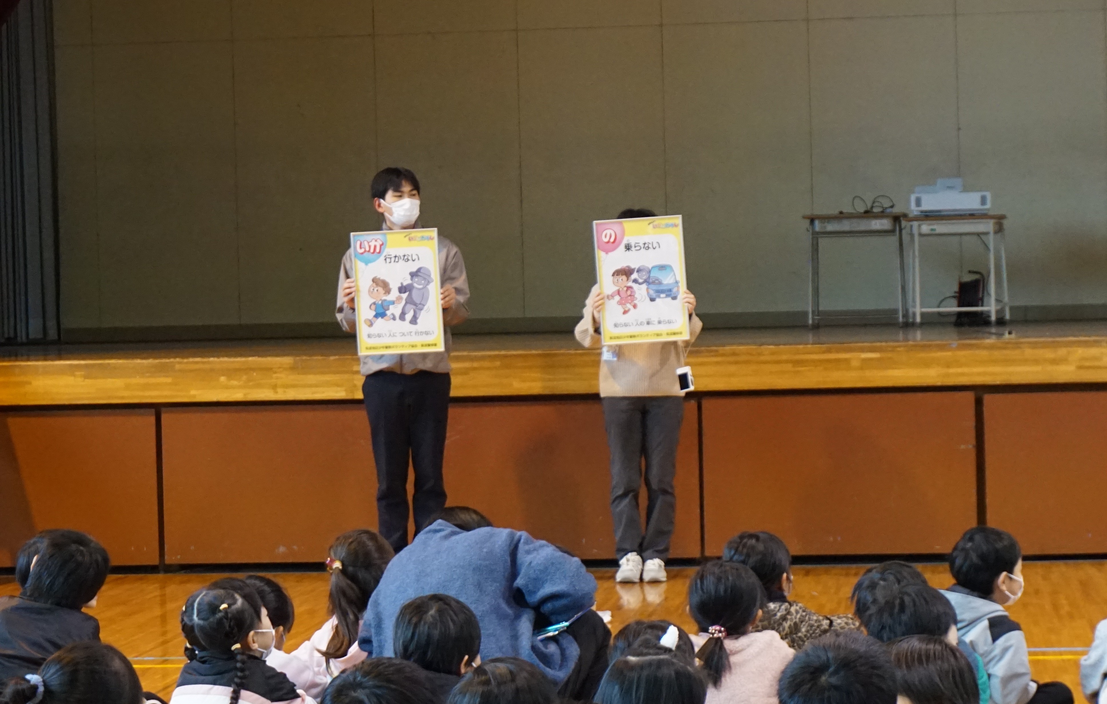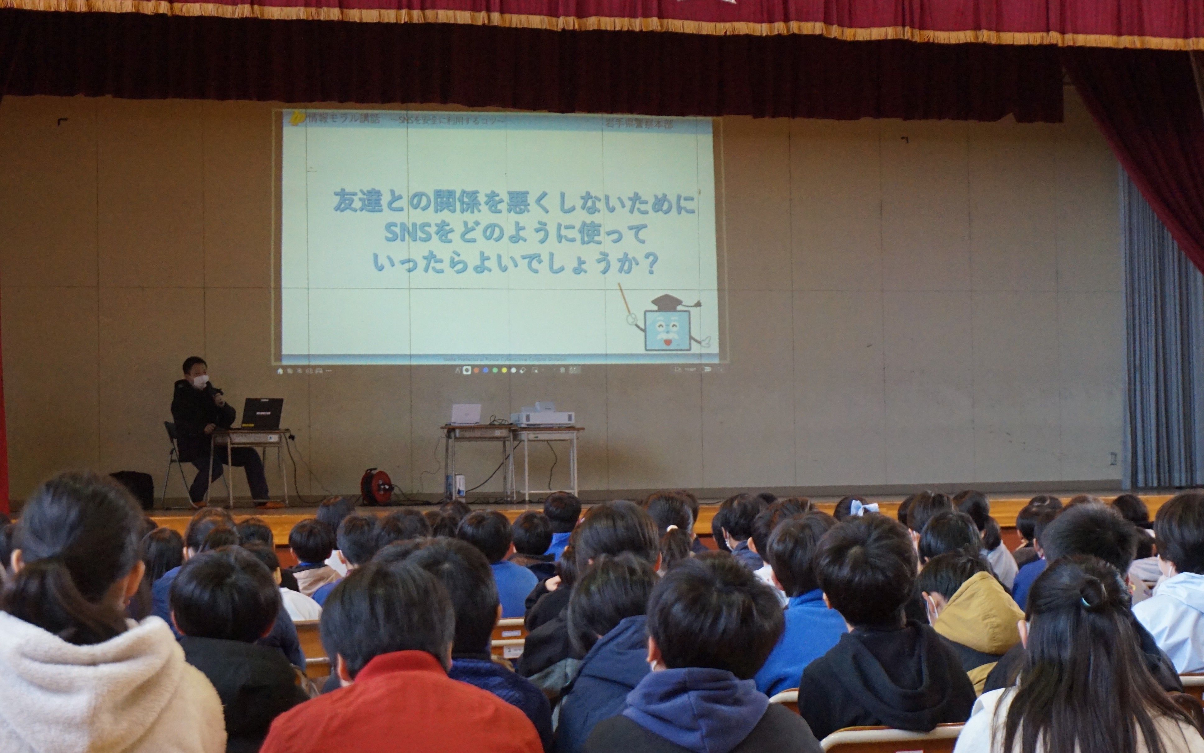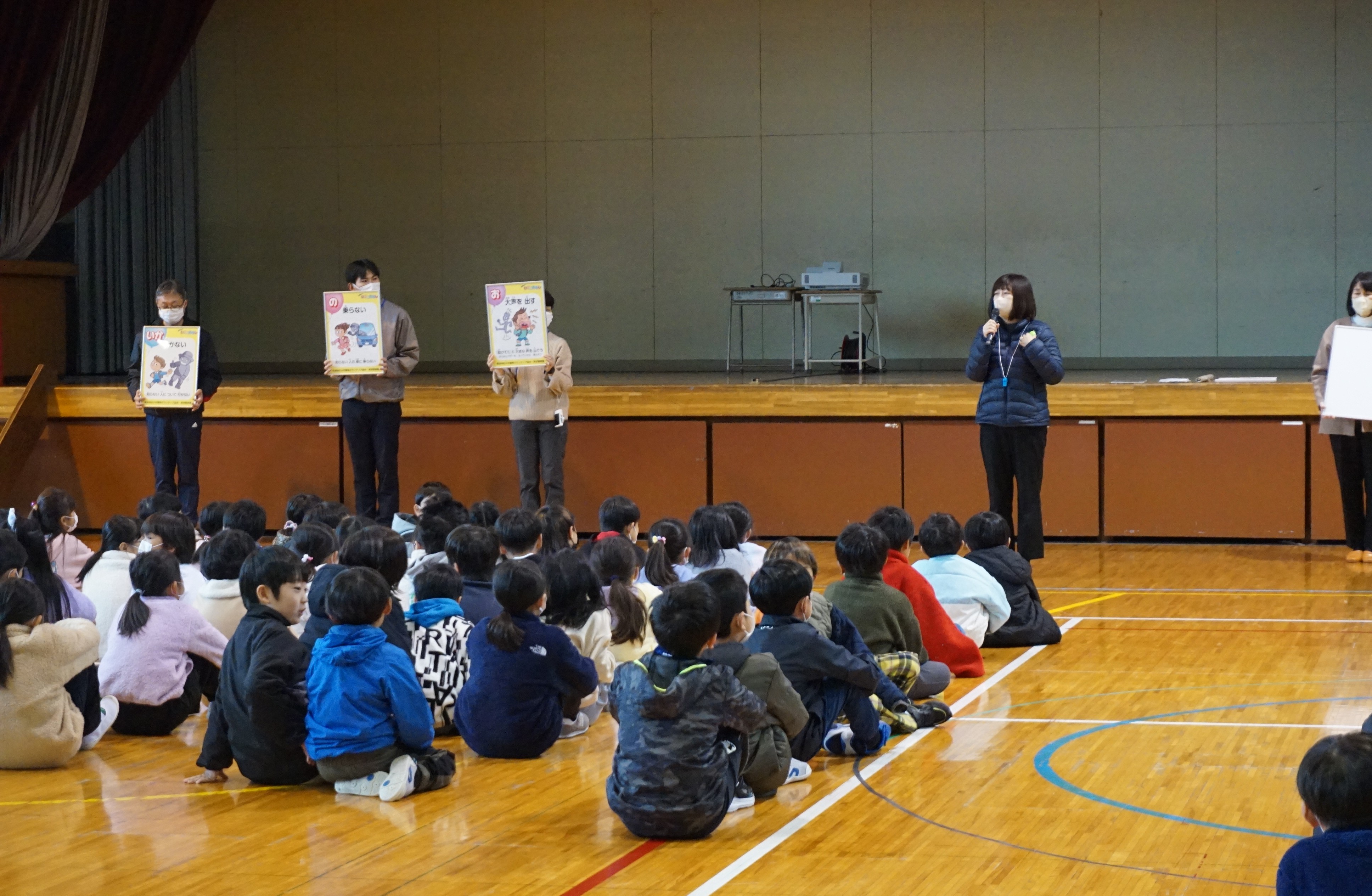 11月26日(水)紫波警察署の生活安全課の方をお招きして、2校時、3校時に防犯教室を行いました。2校時は低学年に向けて不審者にあったときの自分の身を守るための行動を「いかのおすし」を中心に教えていただきました。学年ごとに大きな声で「たすけて」と叫ぶ練習もありました。3校時は高学年向けに情報モラルに関わる内容でした。特にSNSのトラブルやいじめの原因を考え、安全に使用するためのポイントを教えていただきました。低学年も高学年も危険なことや危険なものから距離をとること、何かあったらばすぐに家の人などに話をすることを心がけてほしいです。