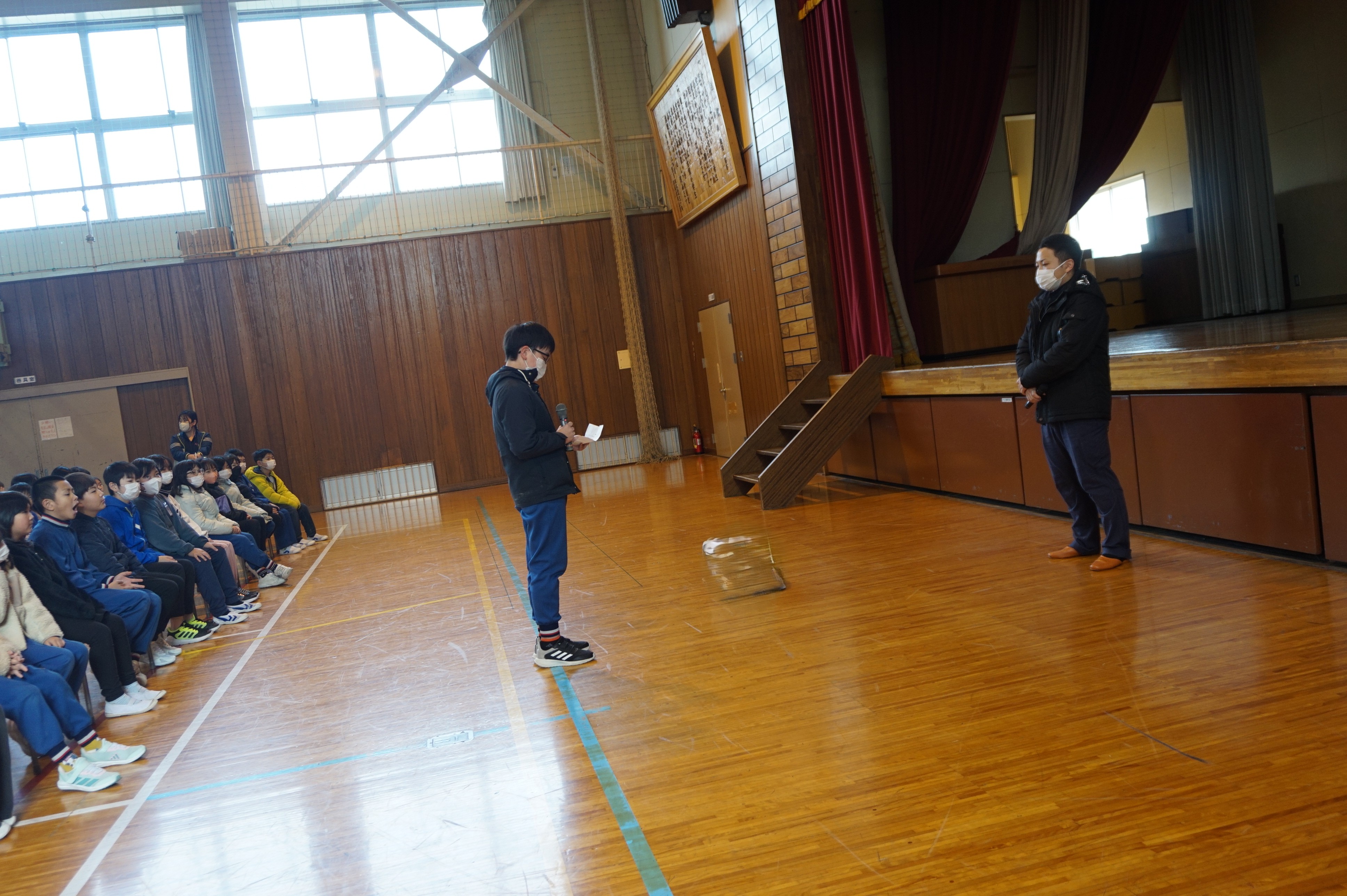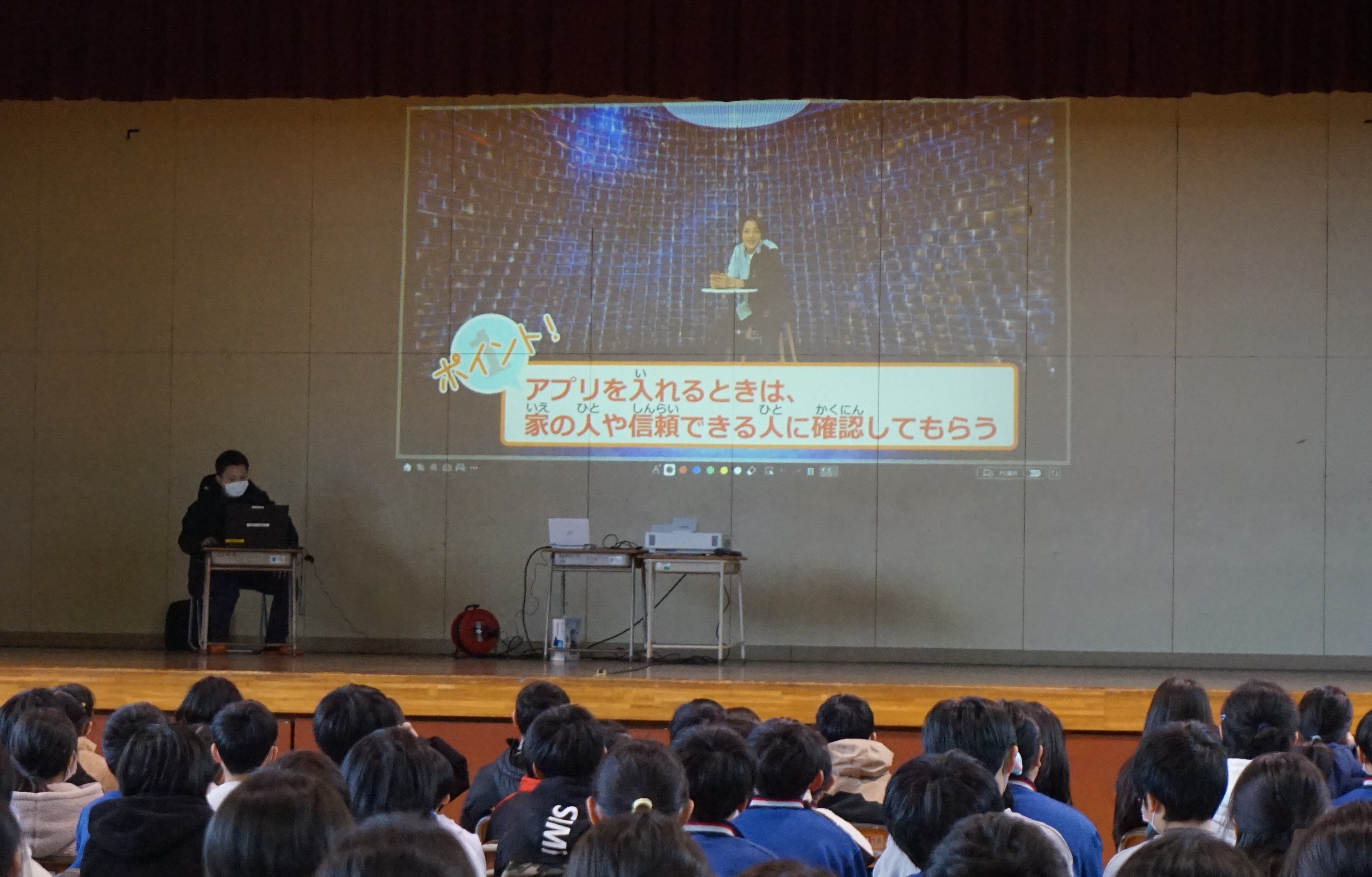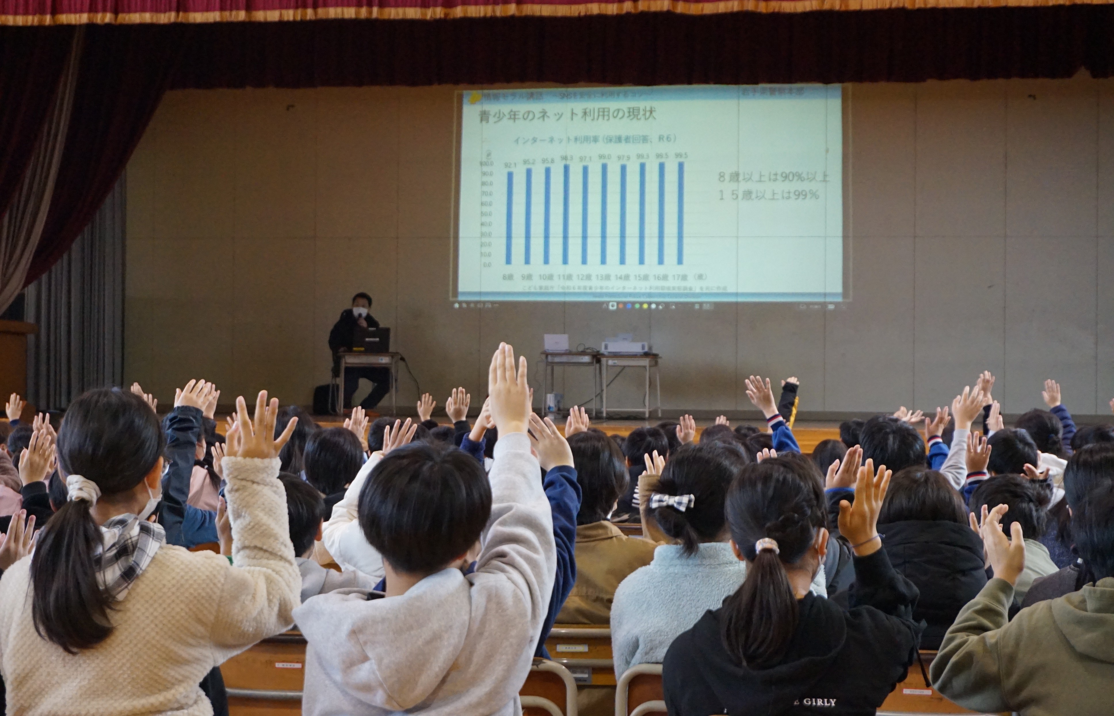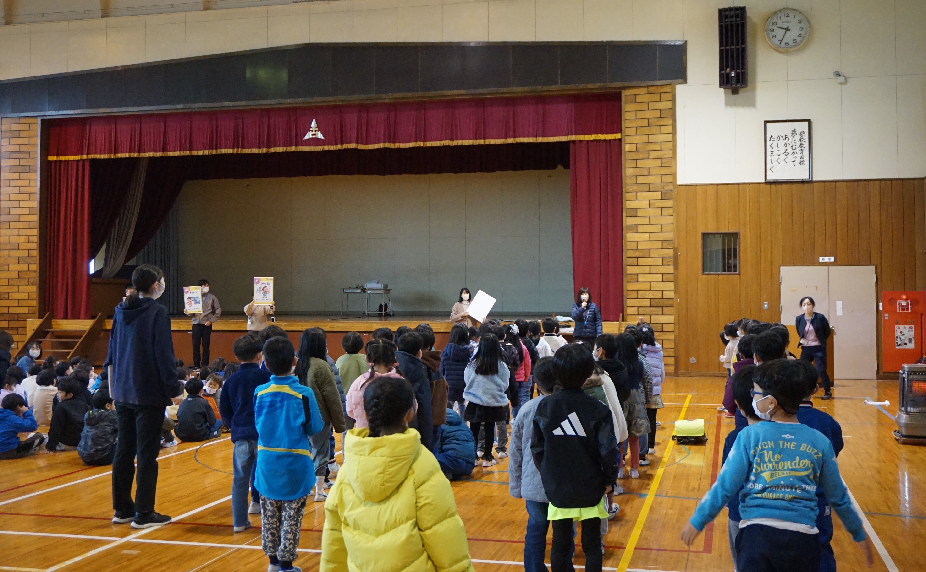 11月26日(水)紫波警察署の生活安全課の方をお招きして、2校時、3校時に防犯教室を行いました。2校時は低学年に向けて不審者にあったときの自分の身を守るための行動を「いかのおすし」を中心に教えていただきました。学年ごとに大きな声で「たすけて」と叫ぶ練習もありました。3校時は高学年向けに情報モラルに関わる内容でした。特にSNSのトラブルやいじめの原因を考え、安全に使用するためのポイントを教えていただきました。低学年も高学年も危険なことや危険なものから距離をとること、何かあったらばすぐに家の人などに話をすることを心がけてほしいです。