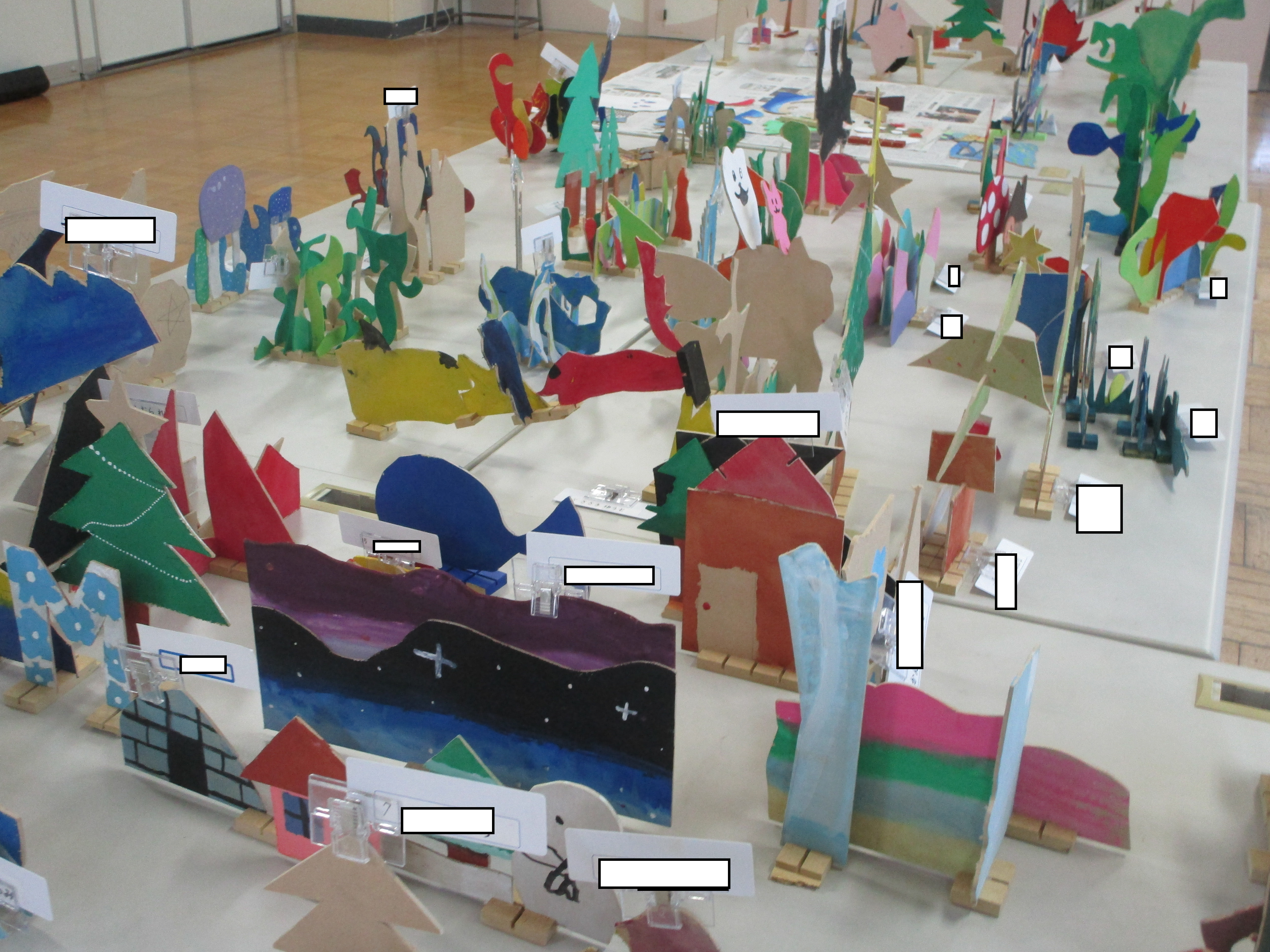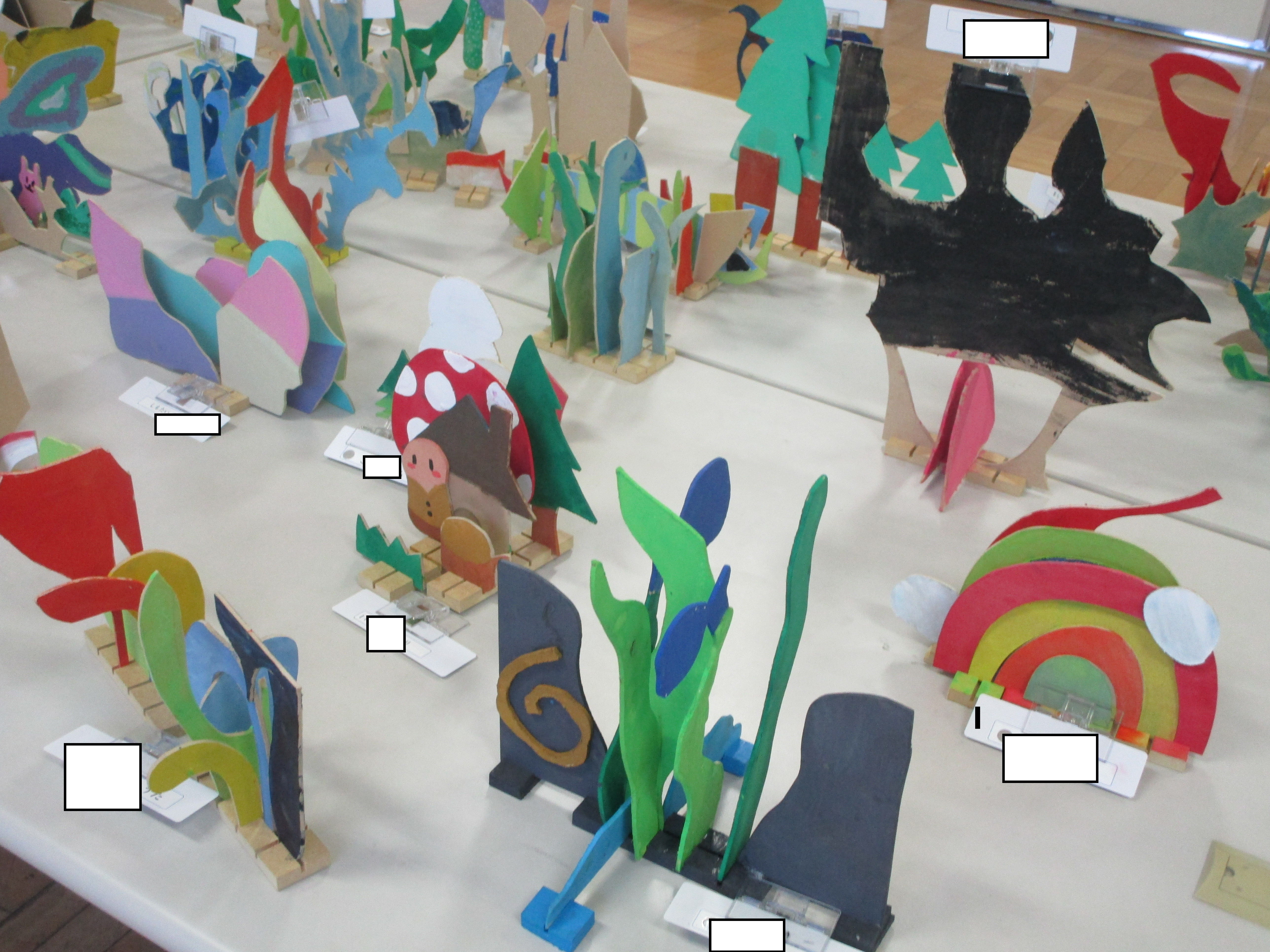 5年生が,図画工作の授業で作った木工作品が展示されています。電動糸のこぎりを使い,曲線もていねいに切ってしあげた作品です。