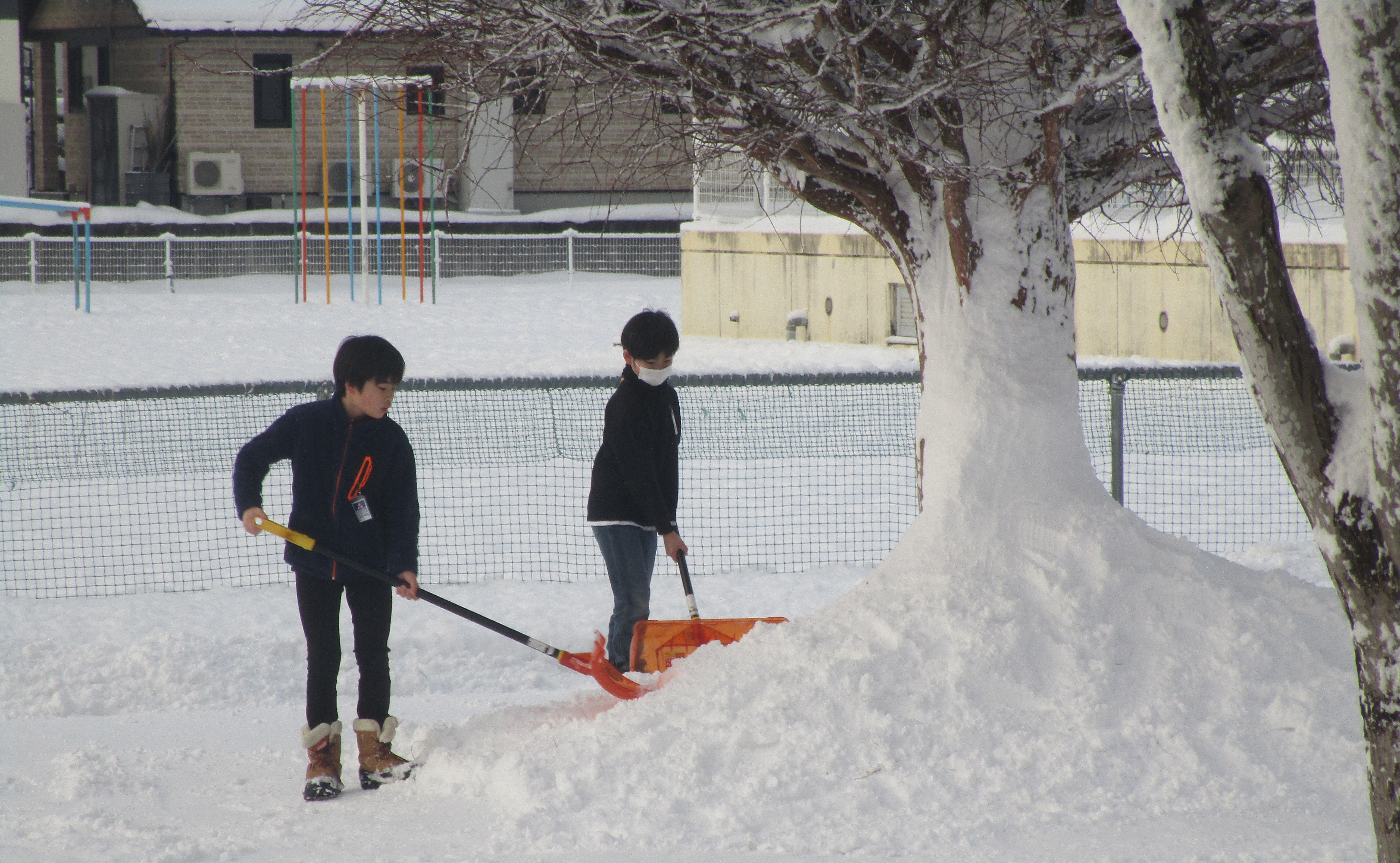けさも,校舎のまわりには,雪が積もっていました。