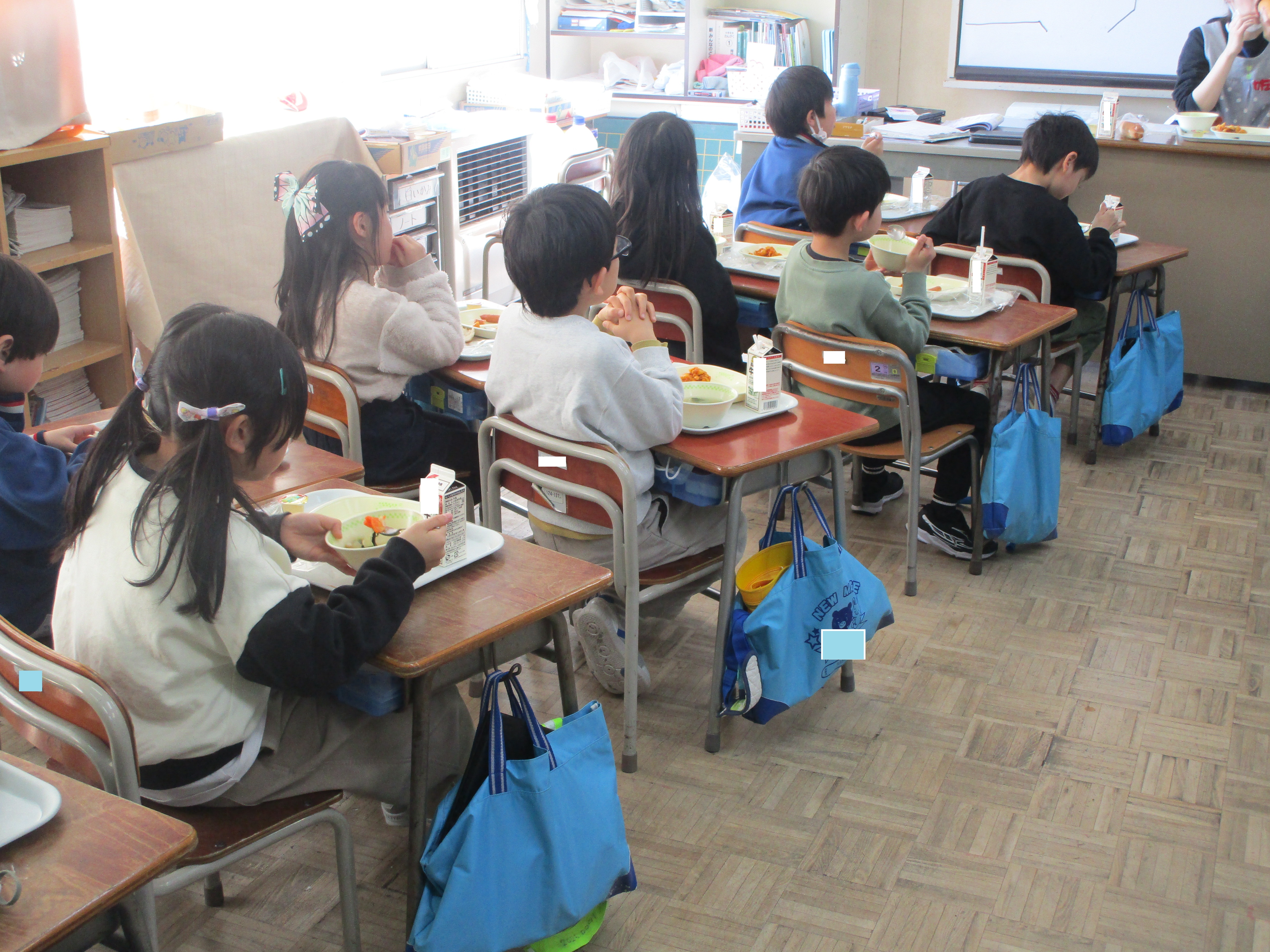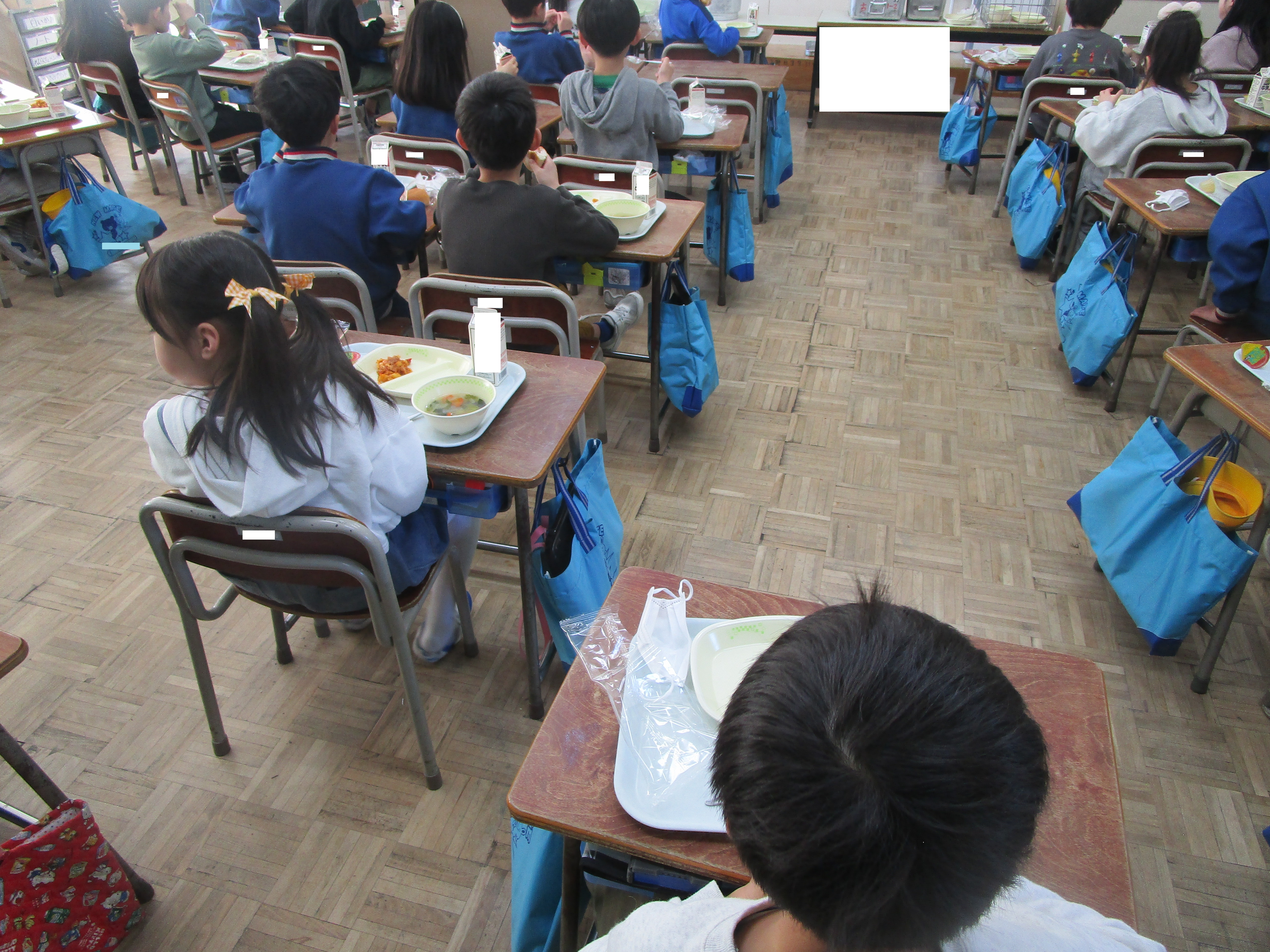 今日は,今年度の給食最終日でした。1年生の教室に行ってみると,子どもたちが,味わいながら,パンやおかずを食べ,スープをのんでいました。教室にたくさんの笑顔も広がっていました。