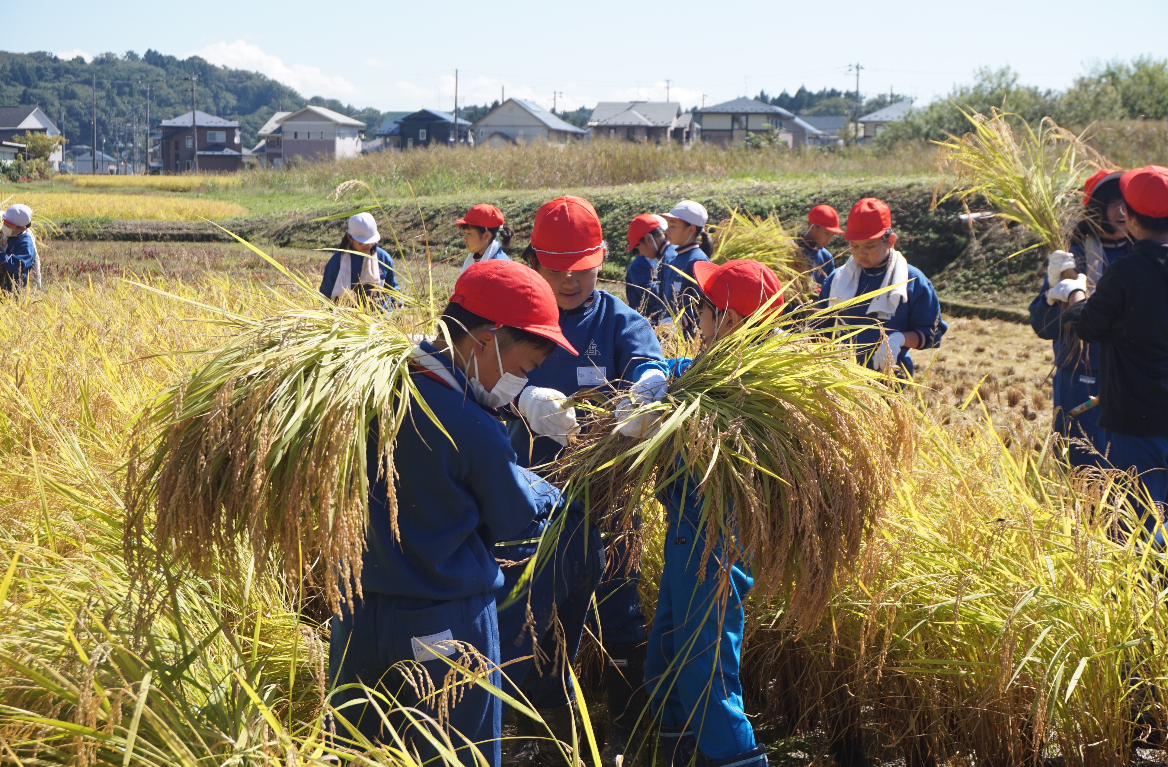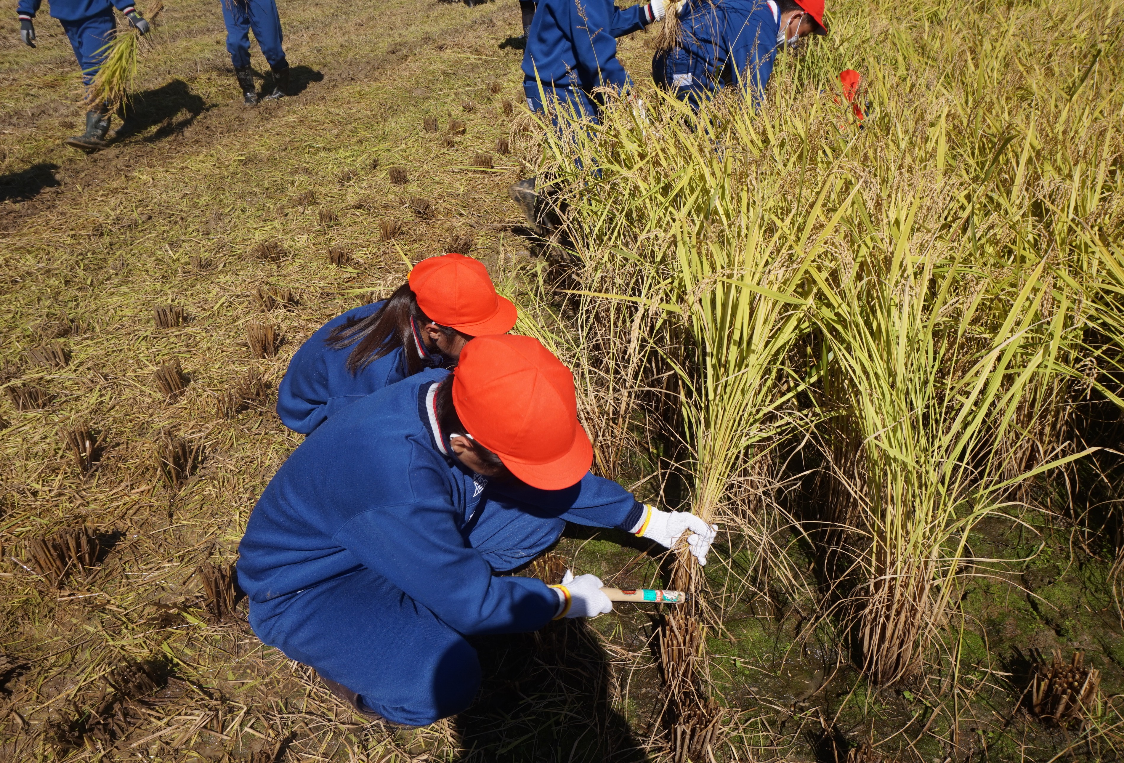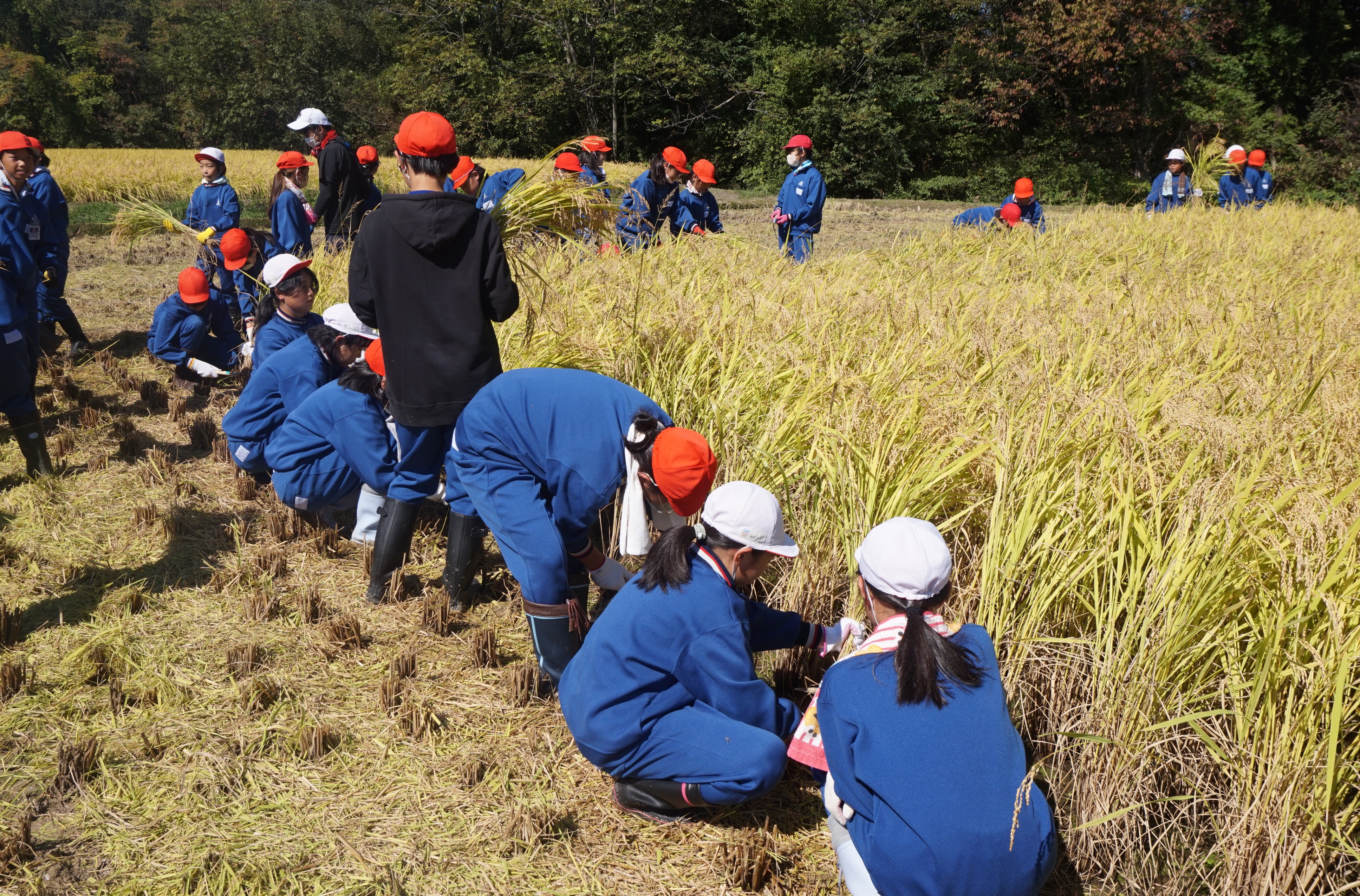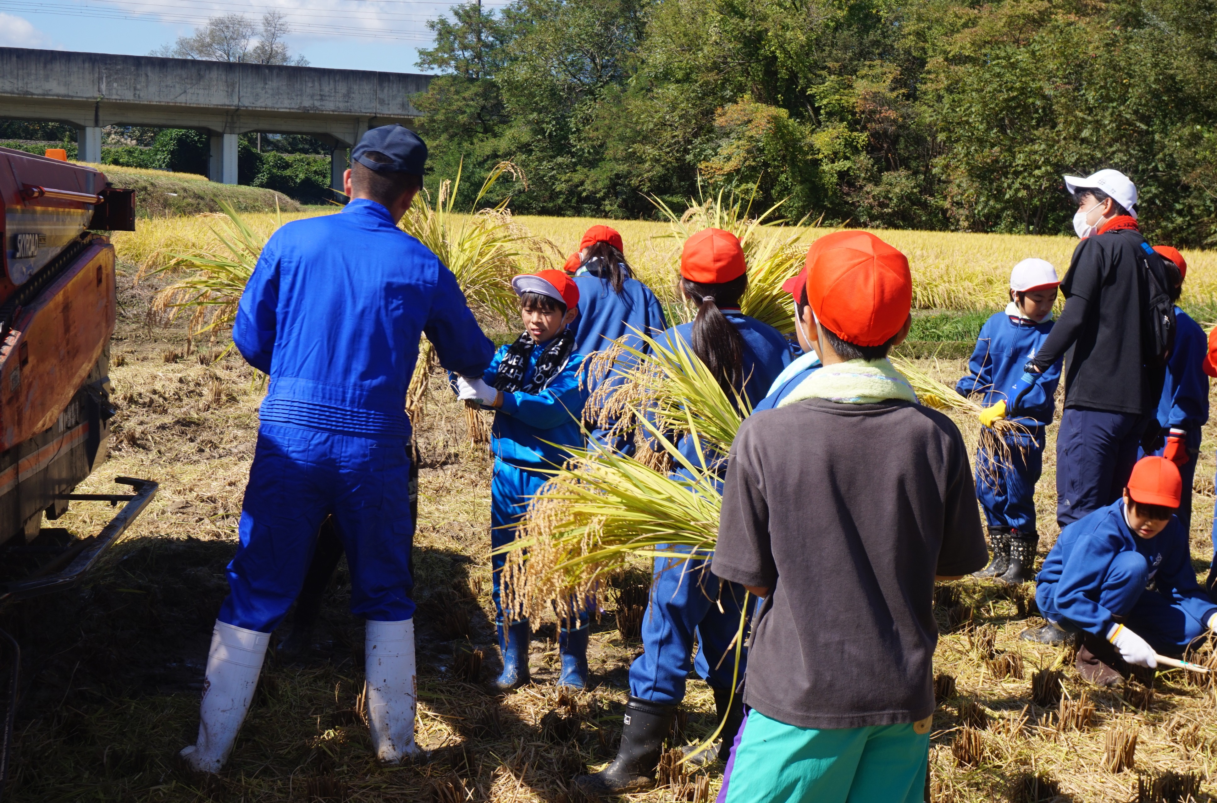 9月30日(火)5月に植えた苗が成長し、黄金色に代わっている田んぼに子ども達は目を輝かせていました。田んぼを管理している地域の方が、稲刈りをしやすいように朝から準備をしてくださいました。鎌の使い方、稲の持ち方など丁寧に説明してくだいました。前日の雨でぬかるんでいましたが、丁寧に稲を刈り取り、稲をコンバインまで運びました。地域の方々に支えられていることを実感した5年生でした。