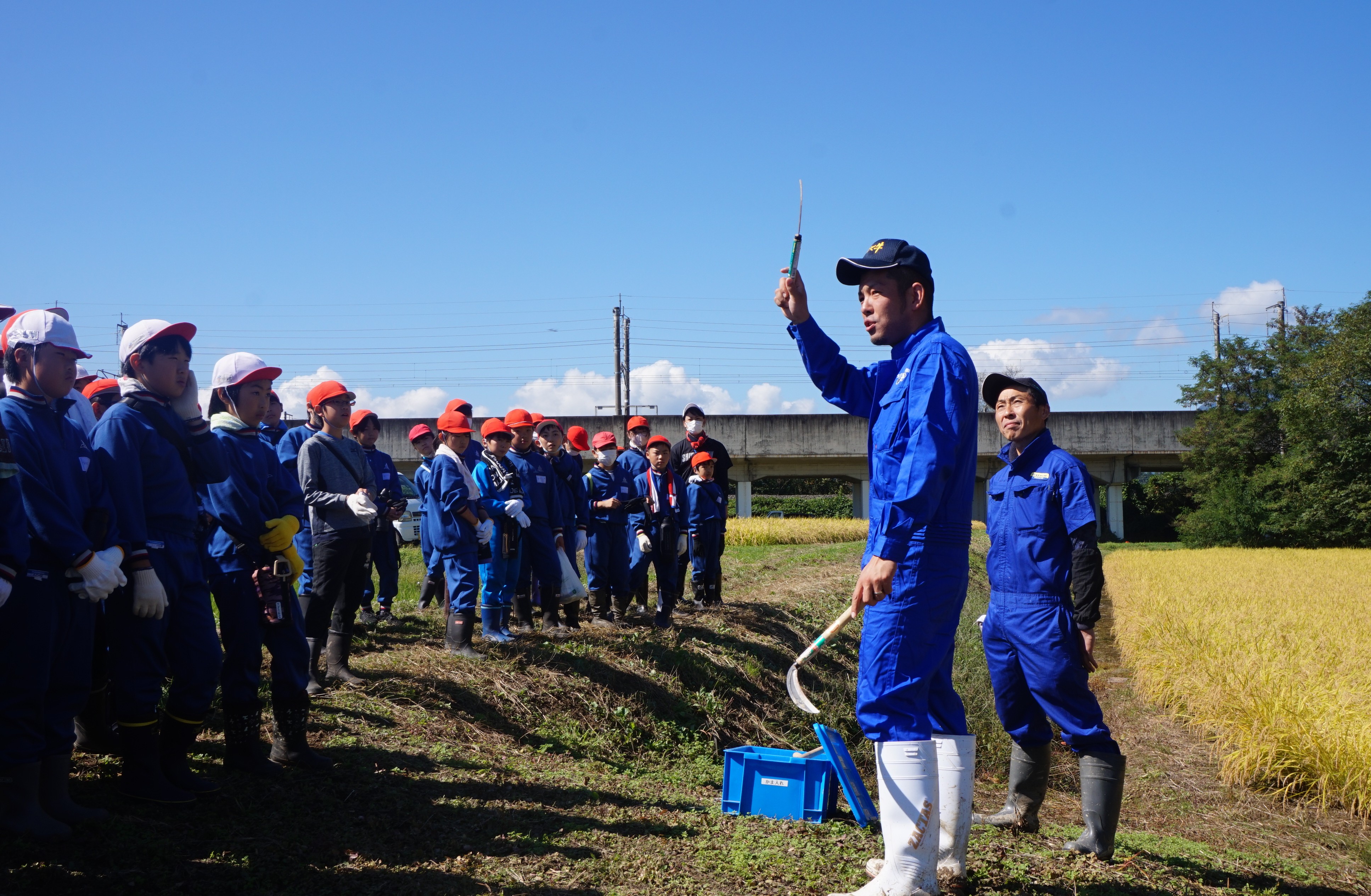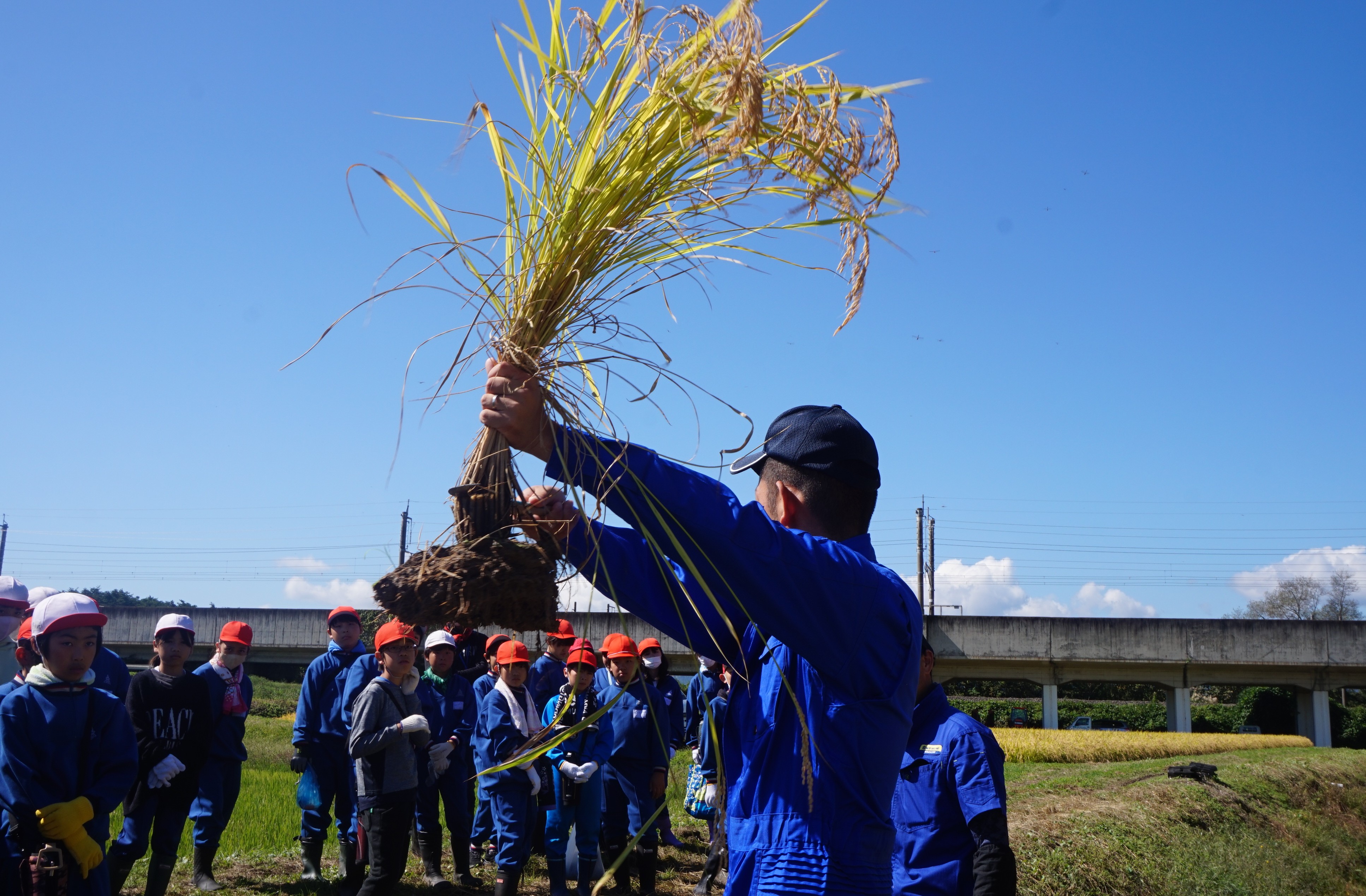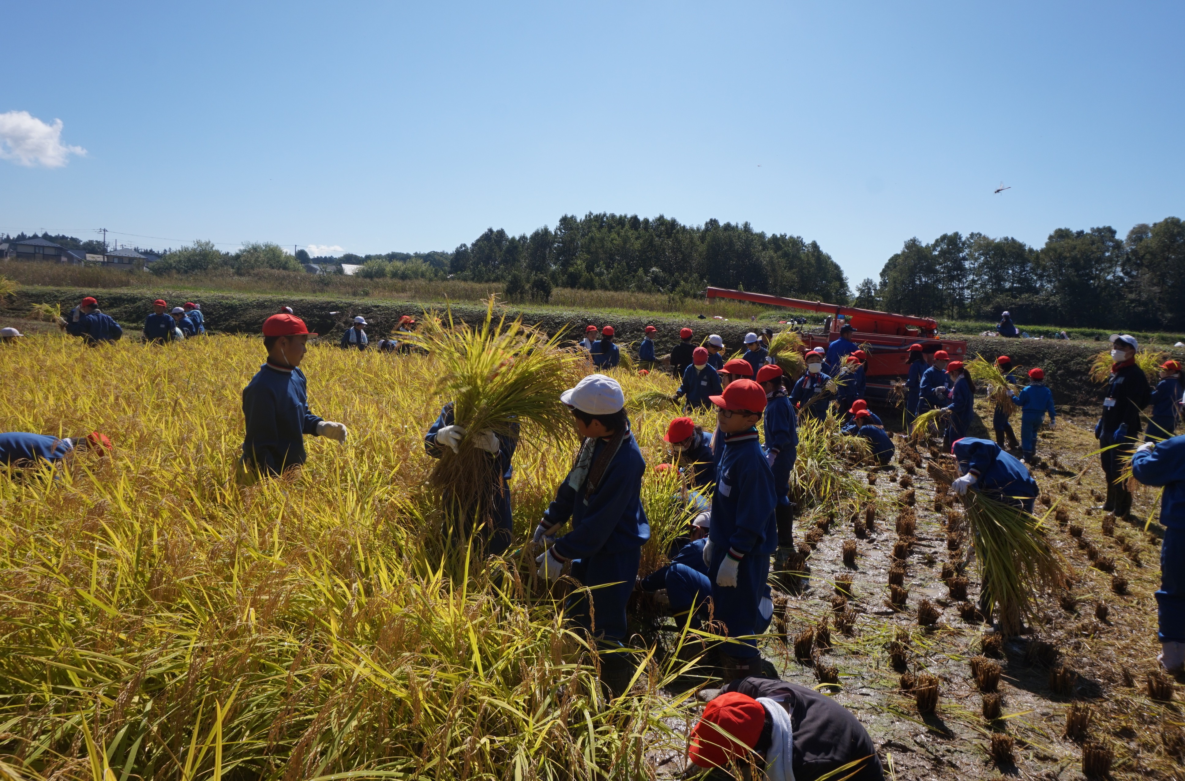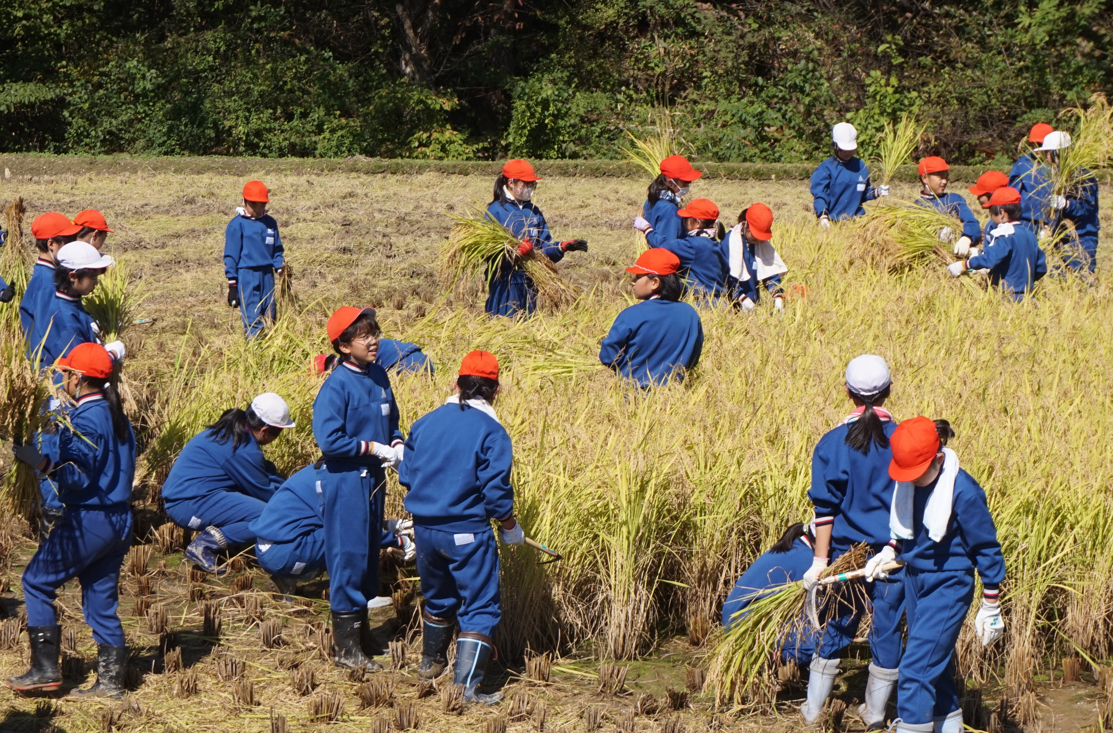 9月30日(火)5月に植えた苗が成長し、黄金色に代わっている田んぼに子ども達は目を輝かせていました。田んぼを管理している地域の方が、稲刈りをしやすいように朝から準備をしてくださいました。鎌の使い方、稲の持ち方など丁寧に説明してくだいました。前日の雨でぬかるんでいましたが、丁寧に稲を刈り取り、稲をコンバインまで運びました。地域の方々に支えられていることを実感した5年生でした。