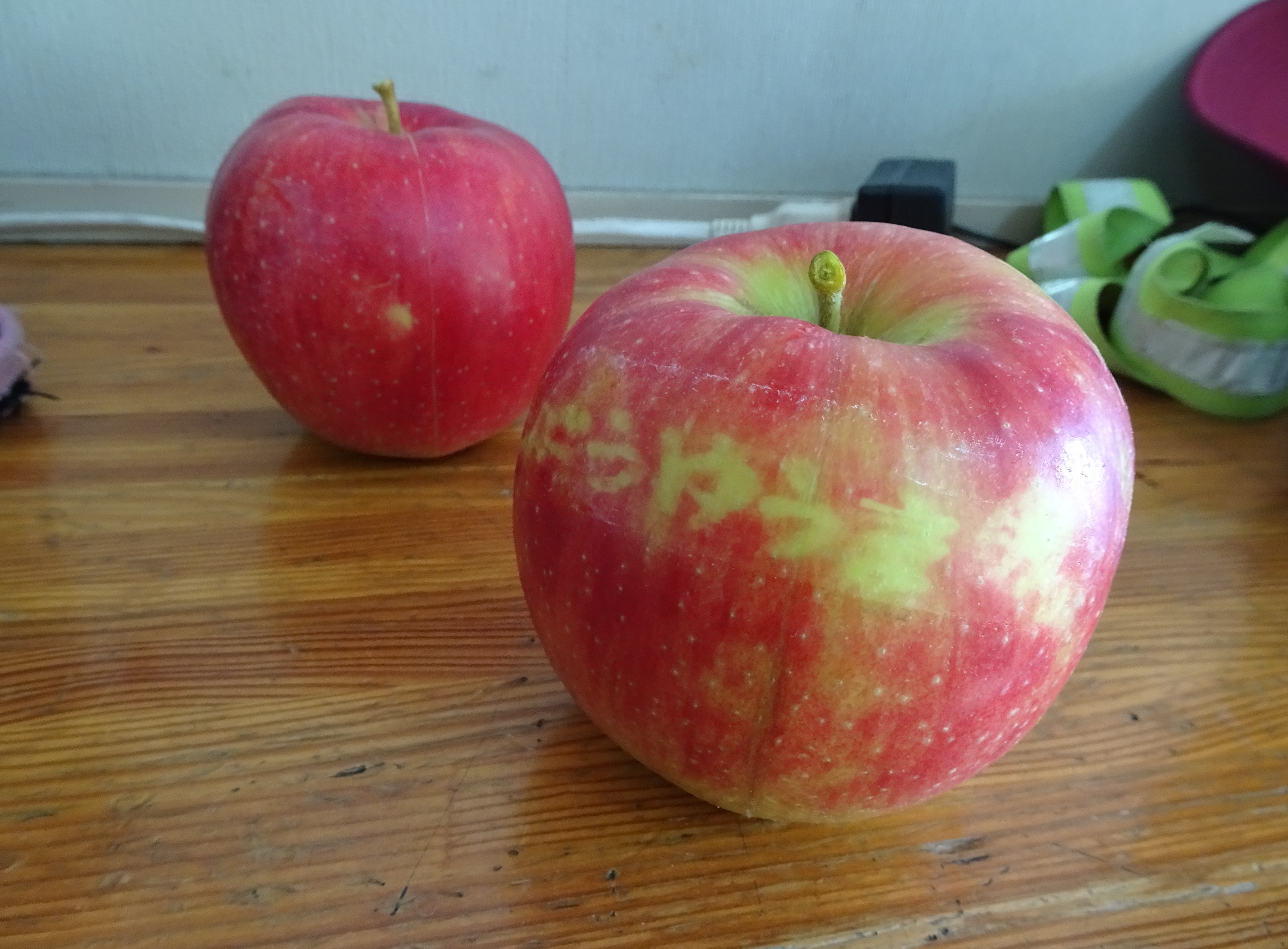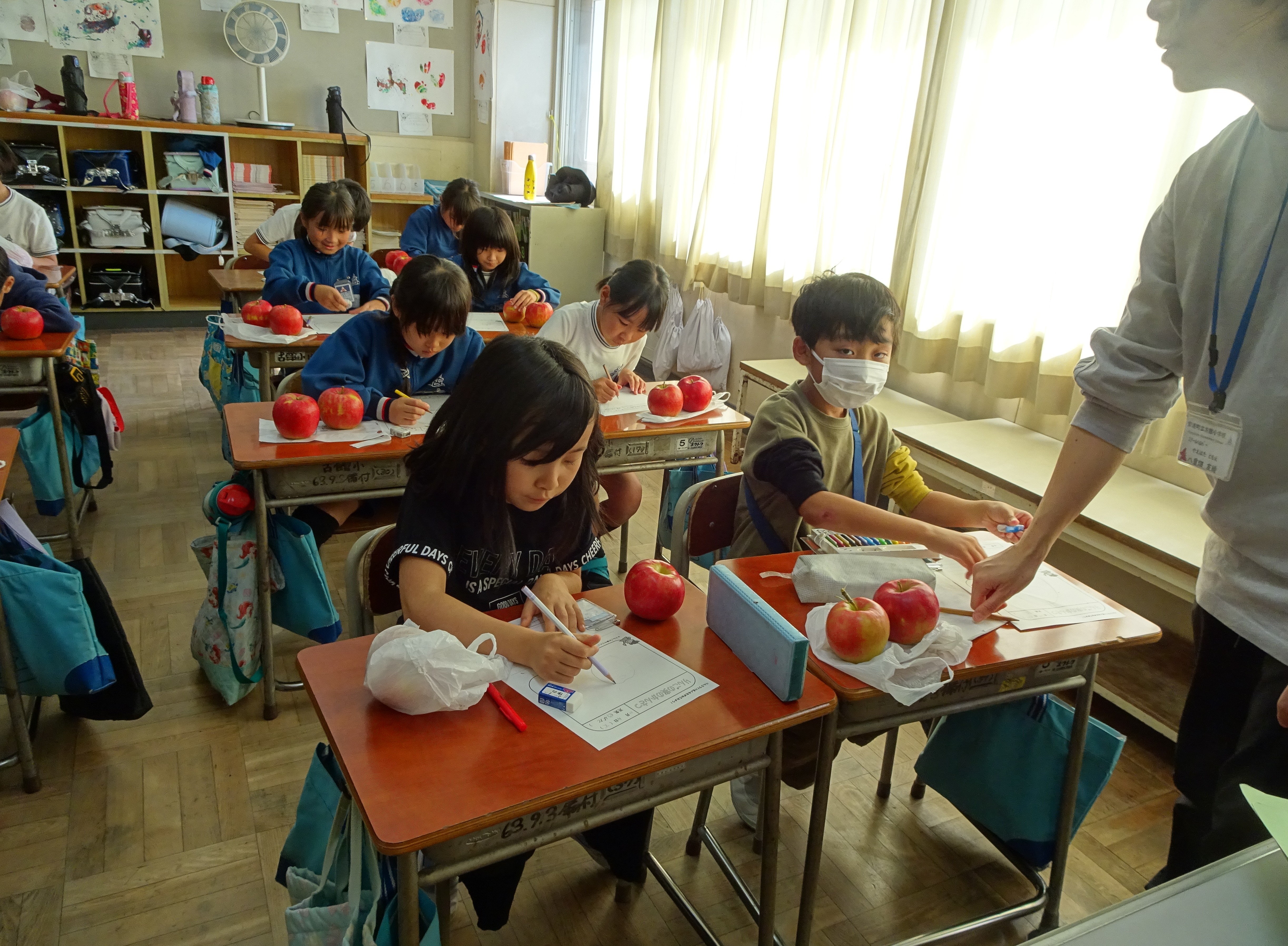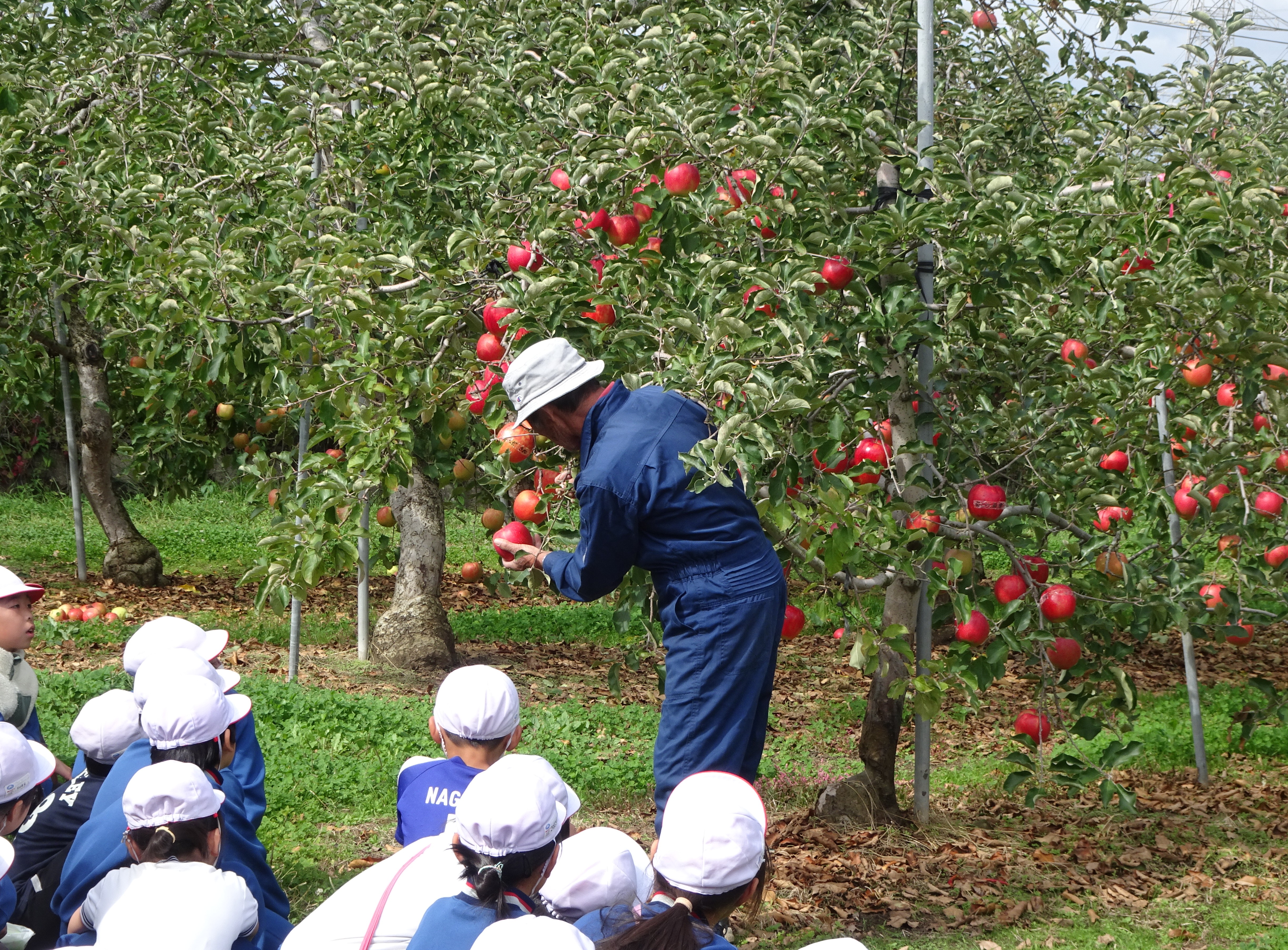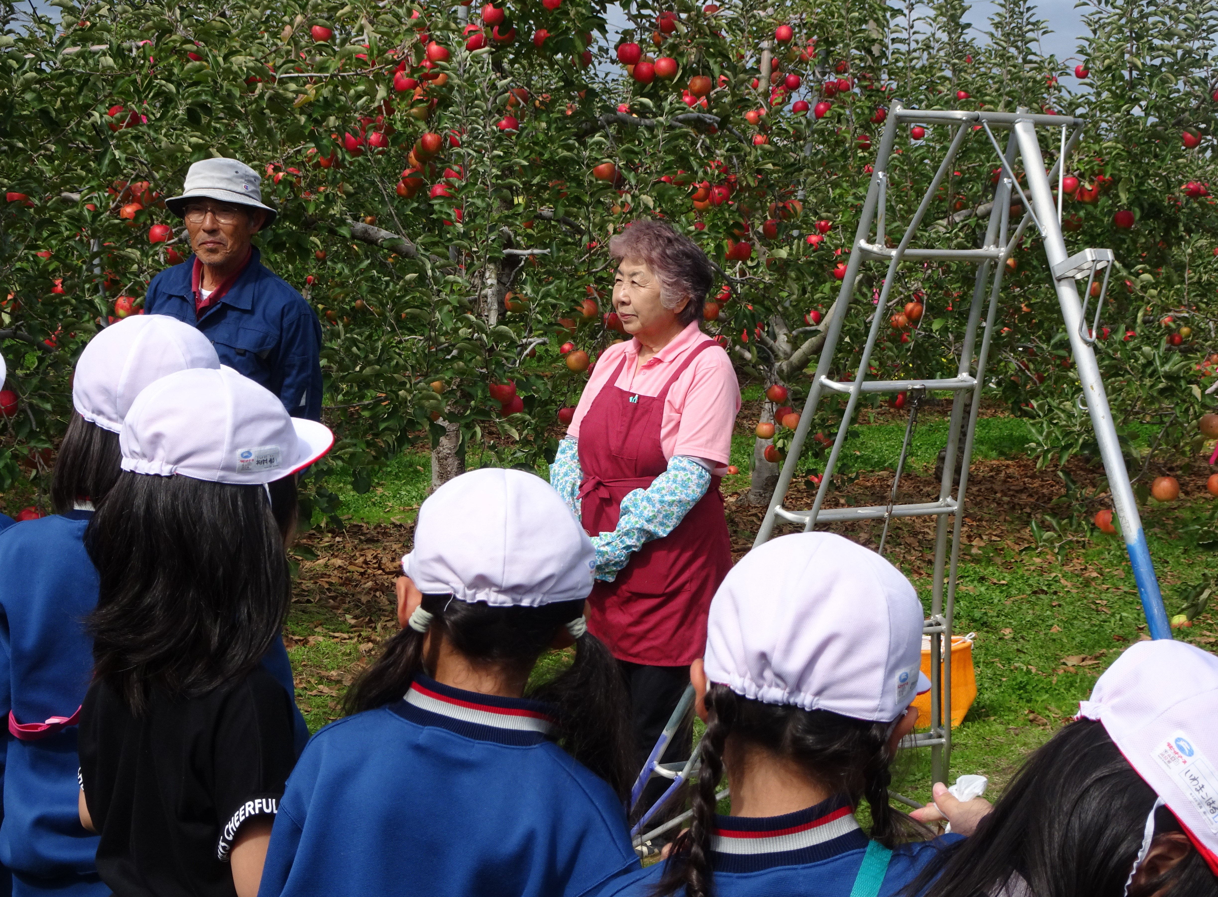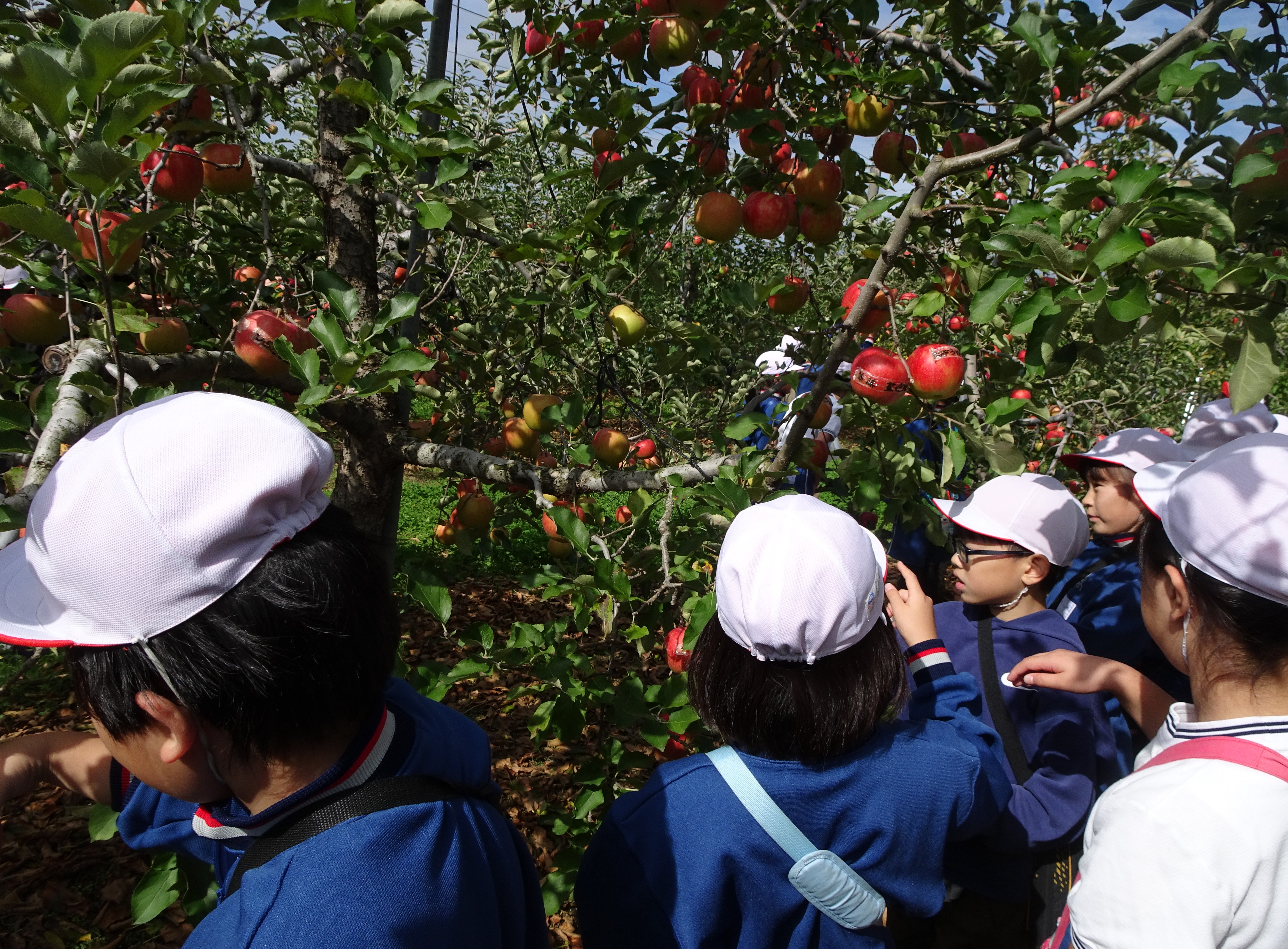10月14日(火)地域の方のご協力のもと、総合の学習の時間で観察していたりんごの収穫をしてきました。4月の下旬から観察を始めた時には白く小さな花が、赤く大きな実になりました。りんごが赤く色づく前にセロテープに名前を書き、貼ることで名前の部分以外が色づき、テープをはがすと名前が残ります。自分だけのりんごを収穫することを心待ちにしていた子ども達は、自分の名前を貼ったりんごを笑顔で探しました。そんな特別な体験をさせてもらいながら「りんごが実るまで」を学習しています。収穫したリンゴを机に置き、じっくり学習の振り返りをしました。ご協力いただいたりんご園のみなさま、本当にありがとうございました。